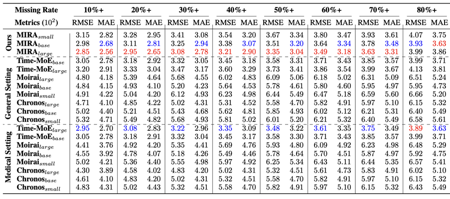 而MIRA得益于Neural ODE,无需任何插值操作即可原生适配。通过建模时间序列的连续动力学特性,MIRA能够直接处理数据中的缺失值,无需额外的预处理步骤。