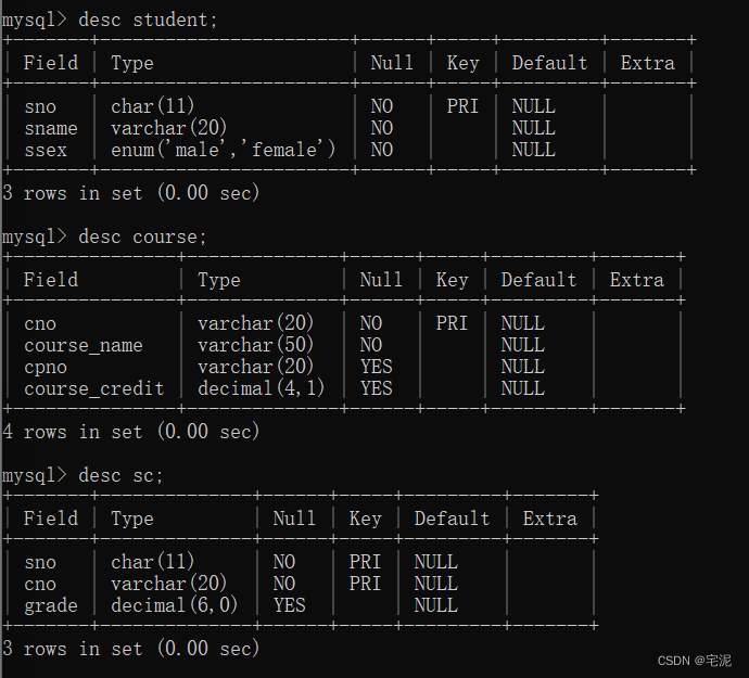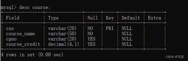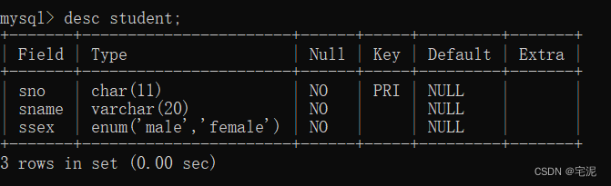 创建student表            create table student(sno char(11) primary key,sname varchar(20) not null);