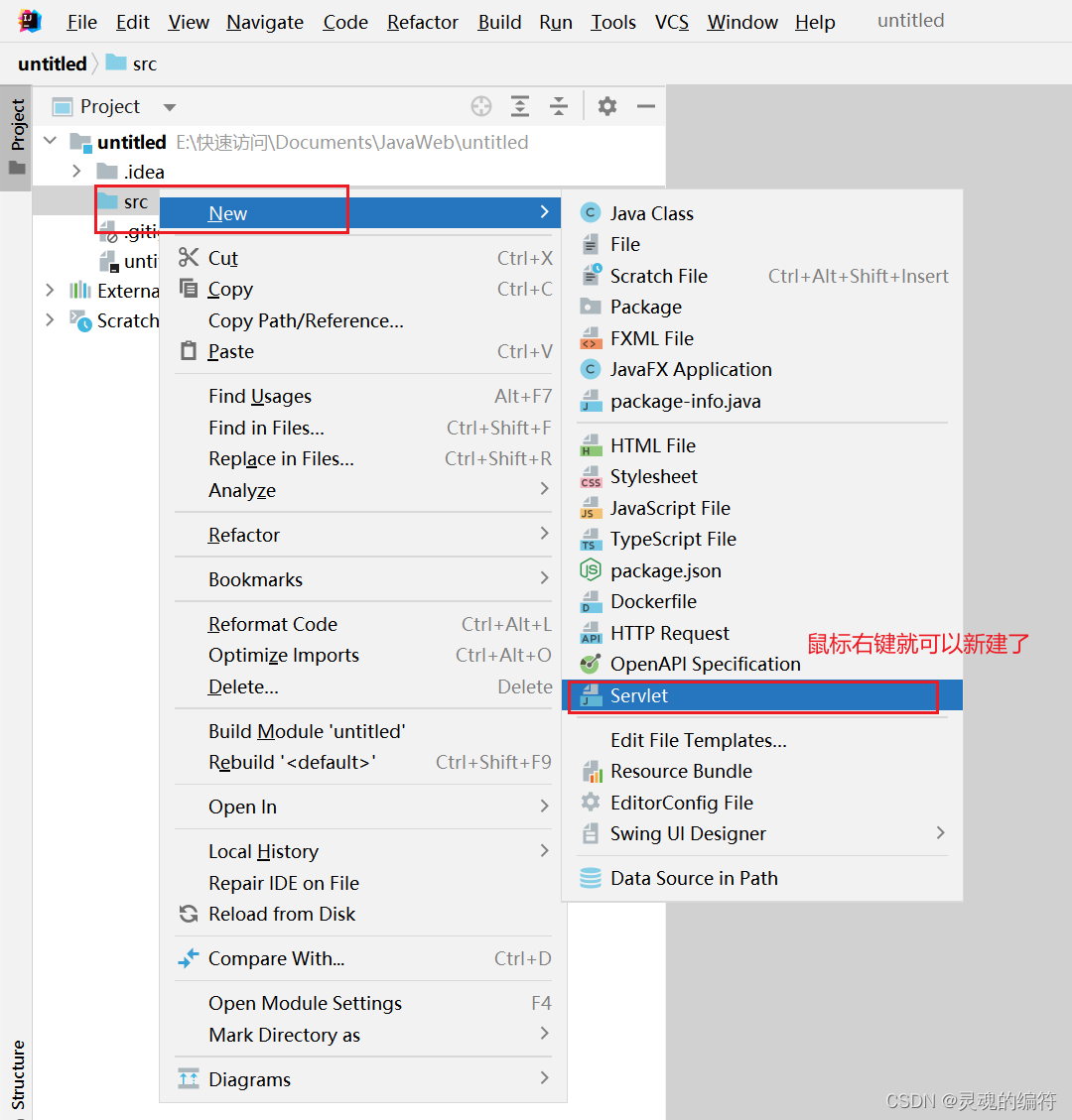 1、选中src鼠标右键,单击New->Servlet