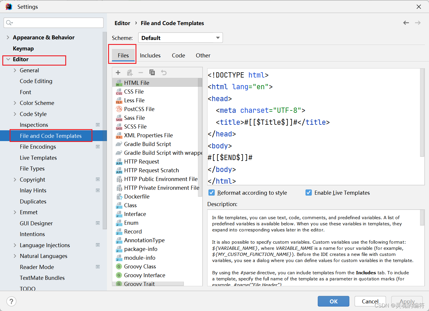 2、展开Editor,单击File and Code Templates,选择Files