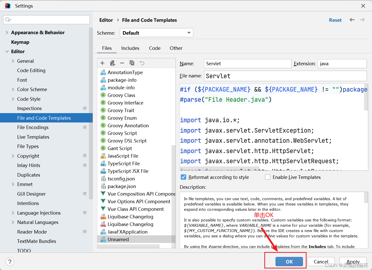 3、单击+号,修改Name和File name为Servlet,复制以下代码块粘贴到idea