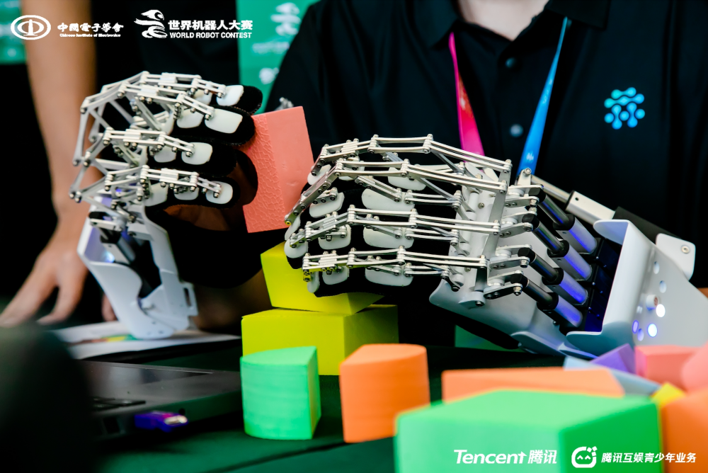 康复机械手脑机接口协作控制赛模拟了残障人士用脑电信号控制康复机械手完成协作任务的过程,重点考察脑控指令的准确性和脑-手配合的流畅度。参赛者佩戴脑电帽,通过注视特定视觉标志或运动想象来操控机械手协作搭积木,最终控制机械手做出OK手势确认完成。本赛项旨在推动脑机接口技术发展,让康复机械手更好地辅助残障人士的日常生活。元思科技组成的YS-QUT战队及Neuro X战队分别荣获本项赛事全国三等奖。
