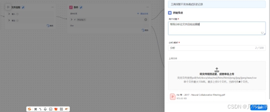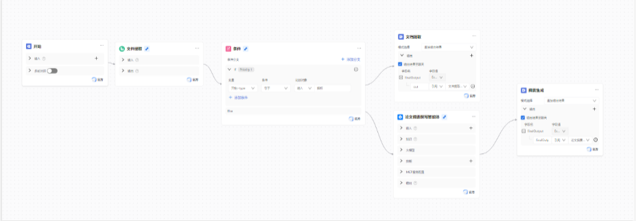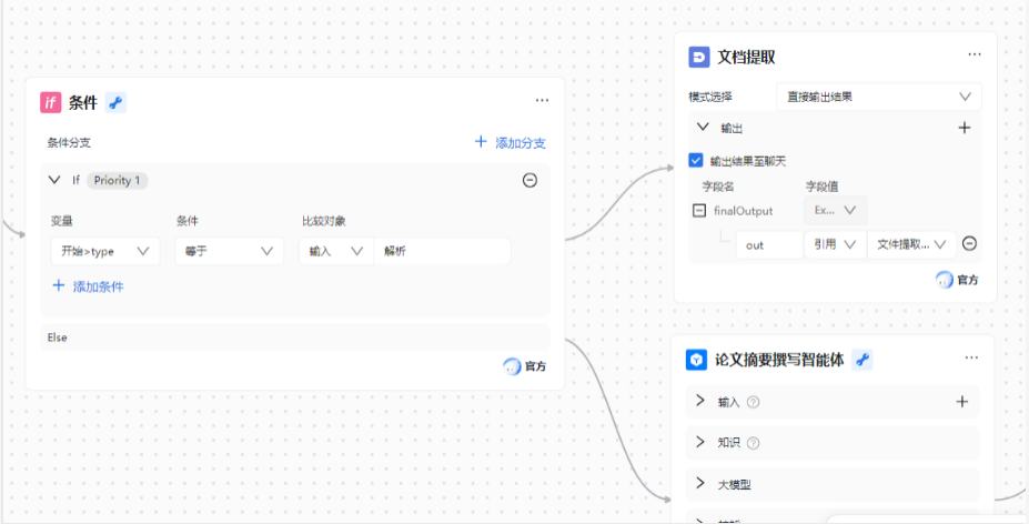 - 需求分支处理:区分 “仅解析文档内容” 与 “生成结构化摘要” 两种用户需求,实现流程动态分支;