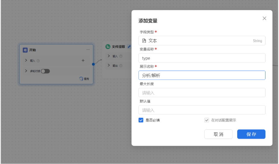 「输入字段」:关联智能表单的 “文件上传字段”,获取用户上传的论文文件;