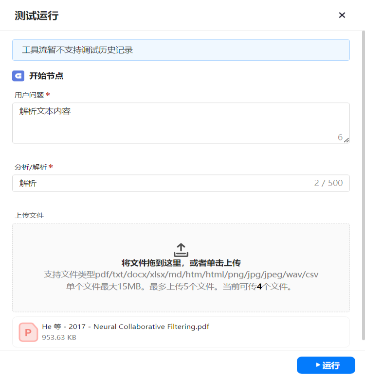 「文件上传字段」:支持 PDF/Word/TXT 等格式,单文件最大 15MB,最多上传 5 个文件;
