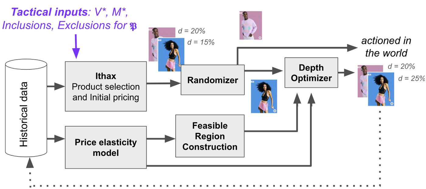 In this framework, Ithax is used to select products to include in the markdown event. Then a price elasticity model is used to forecast likely outcomes across the action space. We use carefully crafted offline validation processes to measure model quality, ensuring that the partial information problem is always present in the train/test split. Crucially, we also then use the offline validation data to constrain the feasible region for decision making. Finally, we optimise depths on a product level to maximise expected outcomes according to business objectives.