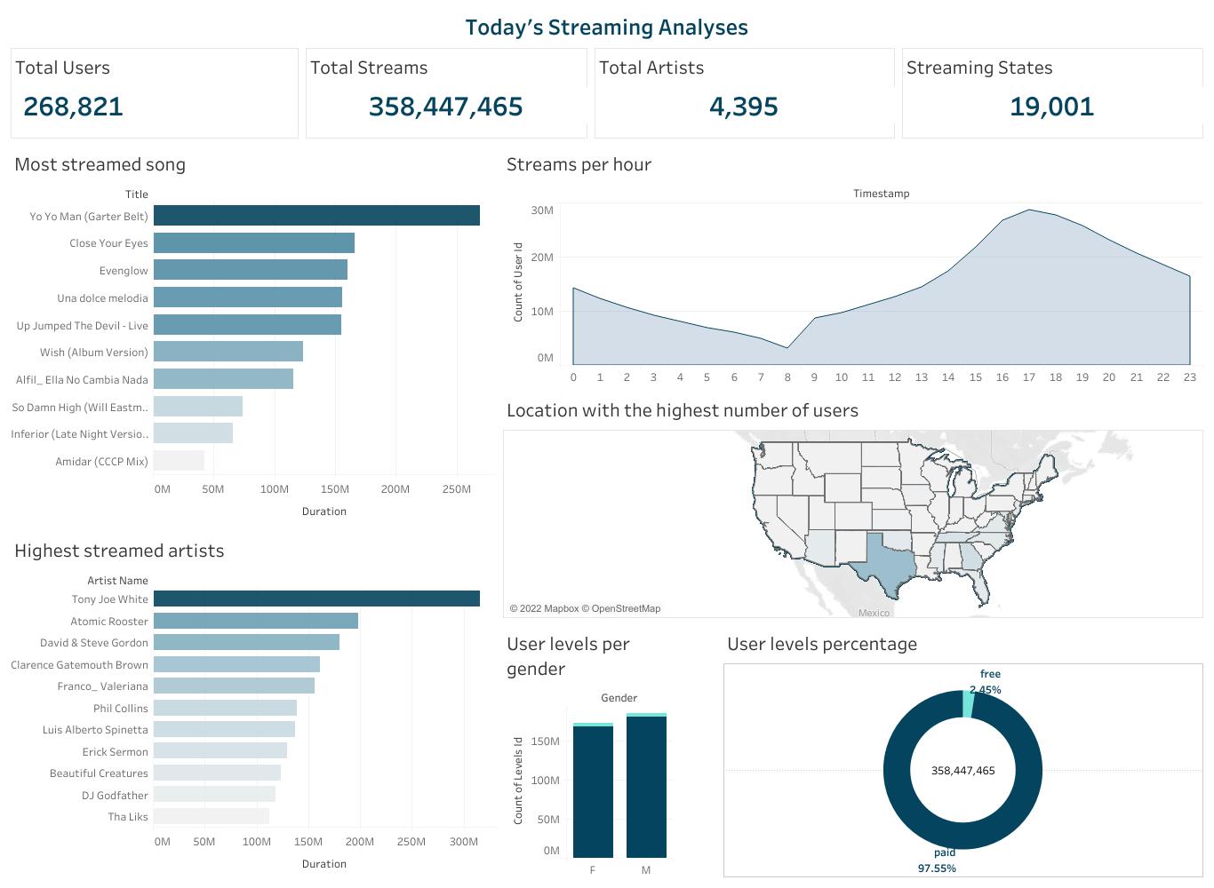 Finally, after all engineering processes are completed, the events carried out on the Streamify application can finally be visualised and analysed. Enabling experts make business decisions that will help developers know their users, and deliver to them better services based on user behaviour.