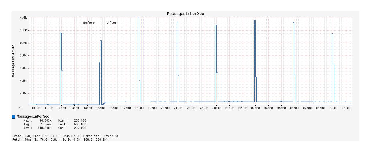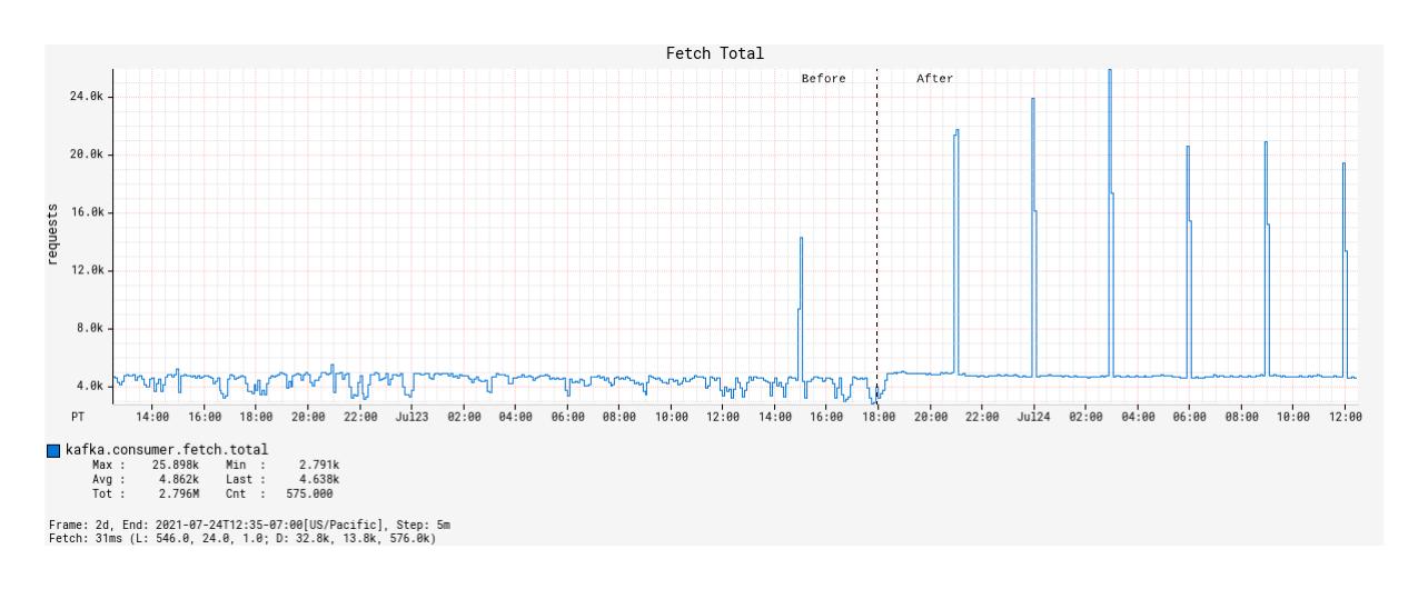 部署后,随着时间的推移,fetch 调用与 Kafka 主题的消息发布率 1:1 对应,包括间隔突发事件(图 4)。在突发事件窗口之外,随着时间的推移,获取调用的数量非常稳定。