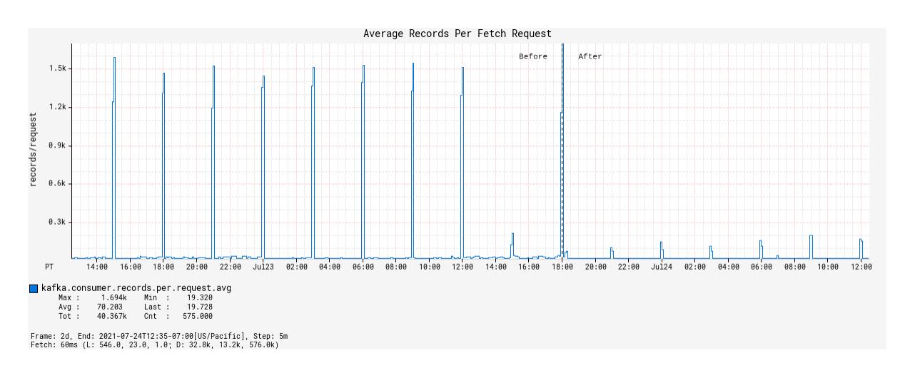 KafkaListener\ 的处理器相比,在突发事件窗口期间每个提取请求提取的平均记录数减少了(图 5)。