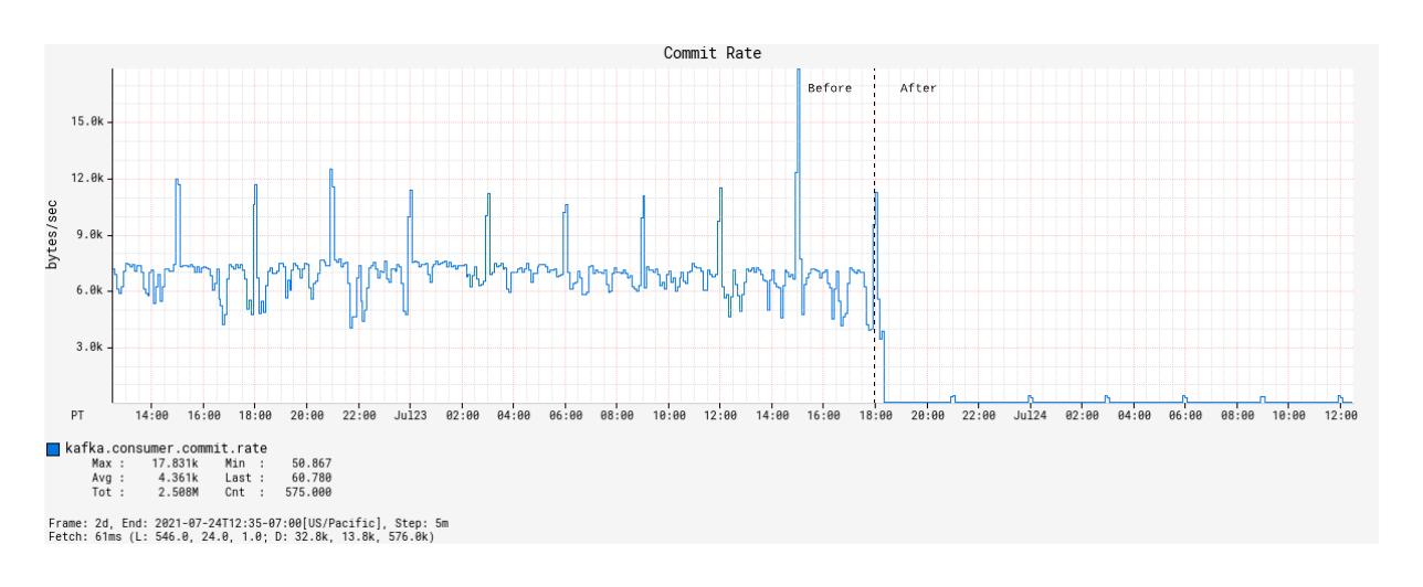 图 8:KafkaConsumer在部署前后随时间的偏移提交率。
