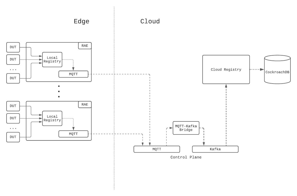 RAE 被配置为有效地连接被测设备 (DUT) 的路由器。在 RAE 上,有一个名为 Local Registry 的服务,它负责检测、载入和维护有关连接到 RAE 的 LAN 端的所有设备的信息。当一个新的硬件设备连接上时,Local Registry 会检测并收集一组关于它的信息,例如网络信息和 ESN。本地注册表会定期探测设备以检查其连接状态。随着设备属性和属性随时间变化,这些更改会保存到本地注册表中,并同时向上游发布到设备管理平台的控制平面。除了属性更改之外,本地注册表会定期在上游发布设备记录的完整快照,作为状态协调的一种形式。这些检查点事件使数据馈送的消费者能够更快地重建状态,同时防止错过更新。