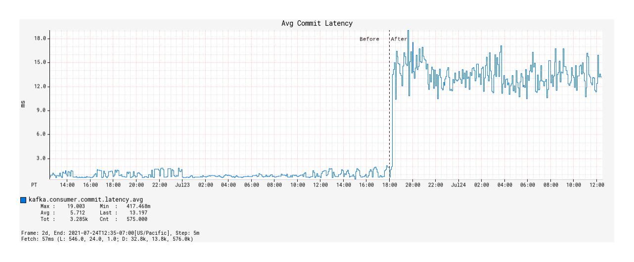 随着基于 Alpakka-Kafka 的处理器的部署,提交率从大约 7 KB/秒显着降低到 50 字节/秒(图 8),但平均提交延迟从平均 1 毫秒增加到 12 毫秒(图9)。尽管如此,这大大减少了提交偏移所花费的网络开销,并且对提高 Kafka 处理的吞吐量做出了重大贡献。