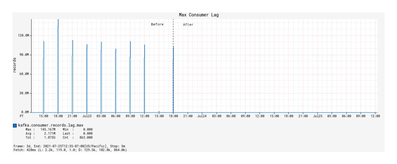 图 6:KafkaConsumer在部署前后随时间变化的最大消费者延迟。