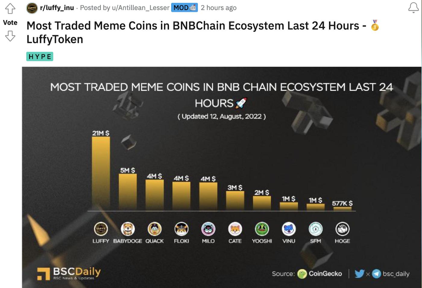 截至 2022 年 8 月 12 日,LUFFY 代币在 BNB 链生态系统中领先 BabyDoge 1600 万美元,成为“交易量最大的 Meme 代币”_。