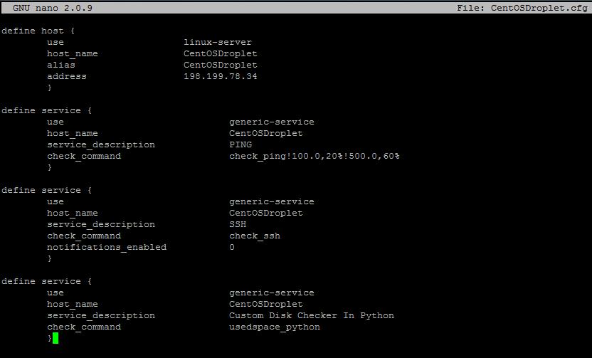 For our example, we will monitor a server called CentOSDroplet and edit /etc/nagios/servers/CentOSDroplet.cfg