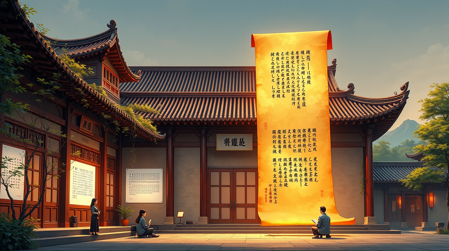 作图提示词:A side view of Yuelu Academy’s traditional architecture enhanced with futuristic knowledge projection systems, digital vines displaying historical texts along ancient eaves, holographic displays of Chu Ci poetry floating near students, an illuminated ancient bamboo slip with digital annotations, blending classical Chinese architecture with subtle biotech interfaces, warm scholarly tones with crimson digital accents, soft glow of projected information complementing the historic setting, highly detailed digital painting style with balanced composition between old and new elements.