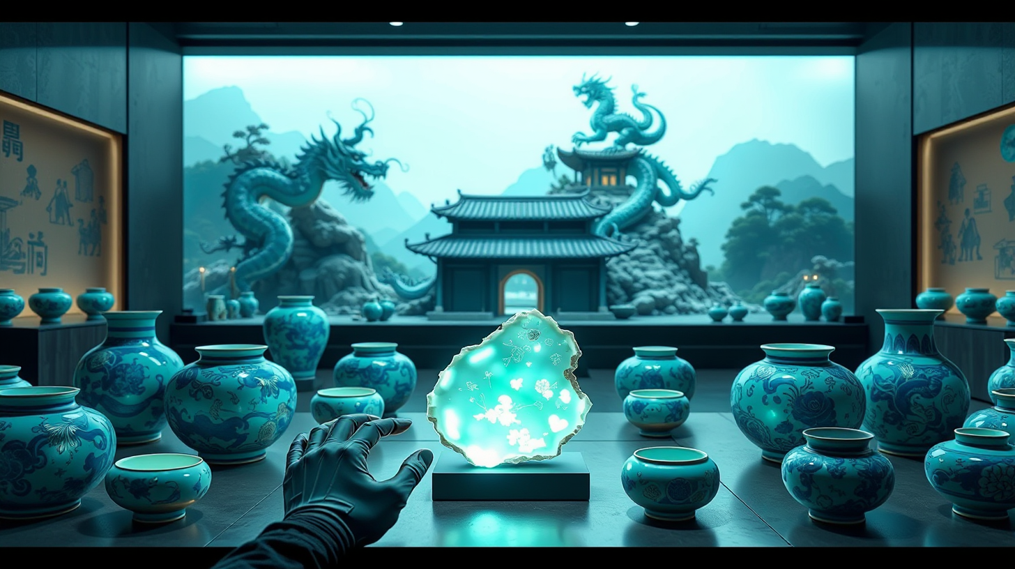作图提示词:A glowing Tang Dynasty porcelain fragment displayed in a futuristic museum, surrounded by interactive celadon ceramics with embedded smart technology. A modern artisan uses advanced touch-control gloves to interface with a holographic reconstruction of an ancient dragon kiln. The ceramics feature vibrant blue and green hues with intricate patterns, illuminated by mystical lighting that enhances their detailed surfaces. The scene is captured with a cinematic composition, ultra-realistic textures, and awe-inspiring visual impact, blending traditional Chinese artistry with futuristic elements.
