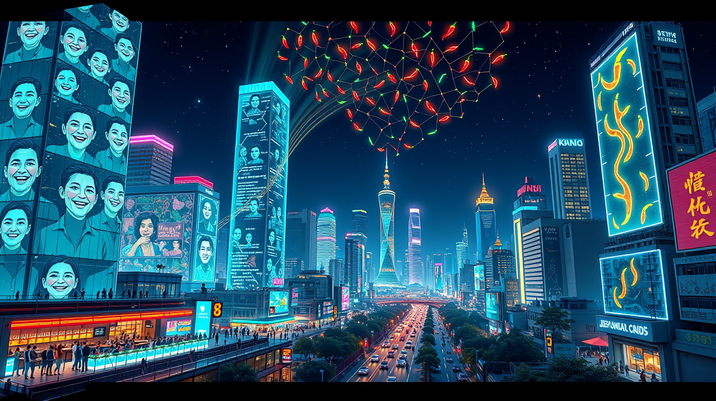 描述:夜幕下的长沙摩天大楼集体变身屏幕,玻璃幕墙同步播放着市民的灿烂笑脸,每一道光影都是城市的心跳。解放西路的酒吧音浪化作彩色光波,如治愈的涟漪扩散至街区。城市中枢将辣椒粒形状的量子芯片射向夜空,芯片排列成“茶颜悦色”的logo星座,与岳麓山的轮廓遥相呼应。整座城市在科技与人文的共鸣中闪耀,让辣味的热情与书香的温婉,共同编织成未来的璀璨星河。