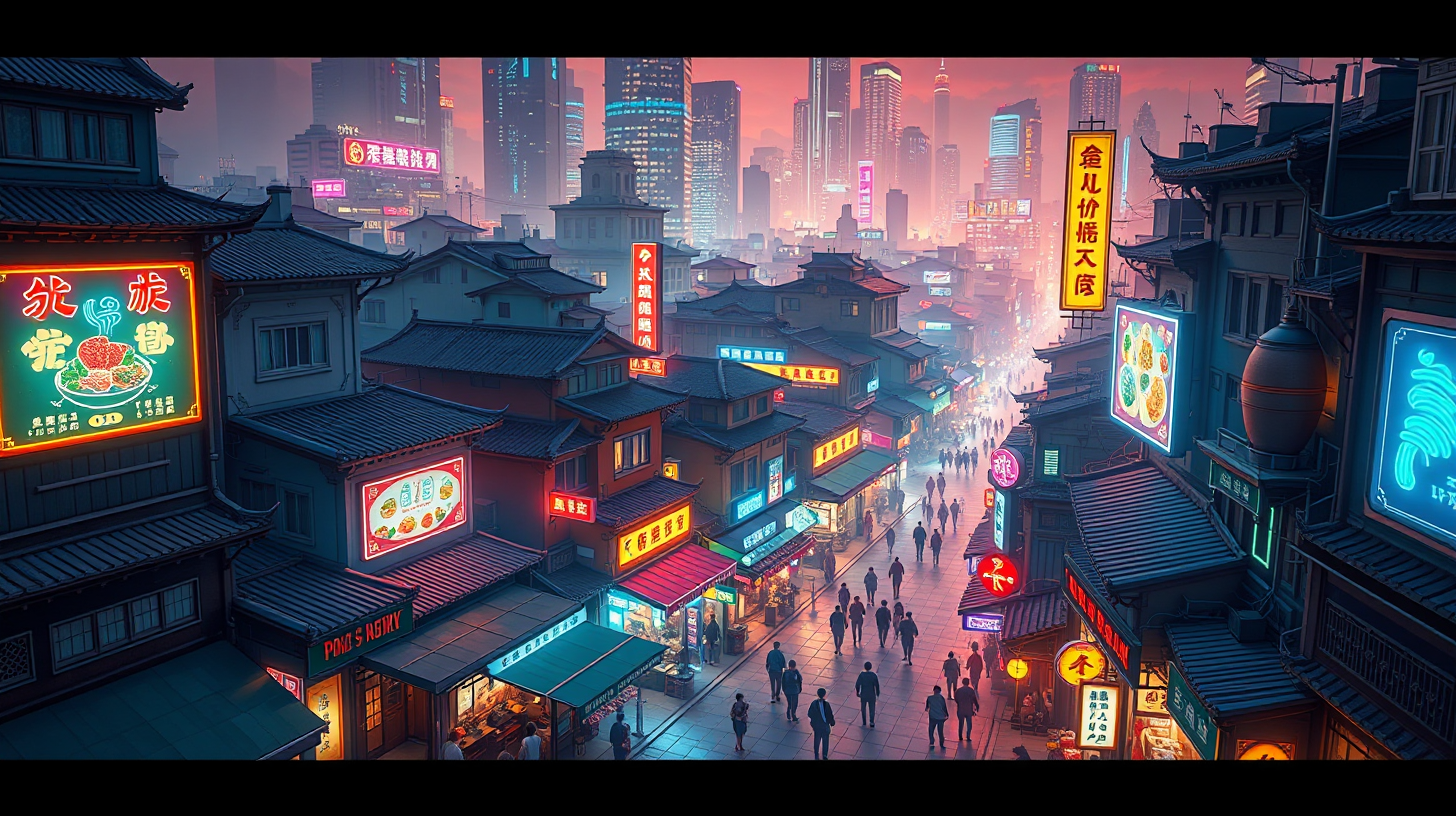 作图提示词:A breathtaking aerial view of Pozi Street at 4 AM, neon lights illuminating the historic street with futuristic holographic projections, digital food displays floating above century-old shops, a chef in a high-tech apron using augmented reality interfaces, glowing recipe projections showcasing Hunan cuisine, ultra-futuristic cyberpunk atmosphere with vibrant neon colors, cinematic lighting with deep shadows and high contrast, highly detailed sci-fi cityscape with a digital art style, capturing the fusion of traditional architecture with advanced technology in modern Changsha.