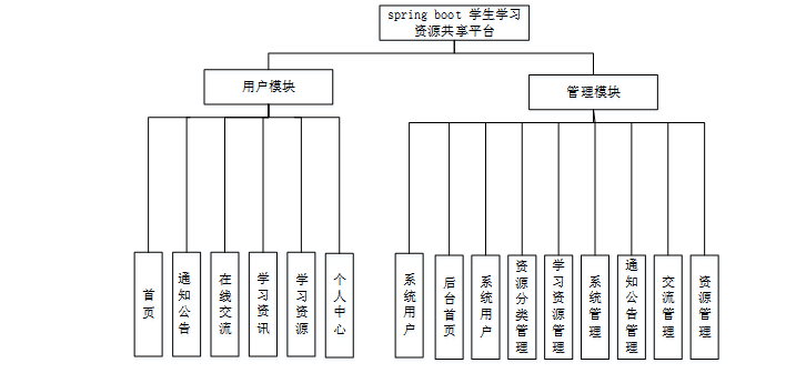 (3)确定好系统使用的技术,进行在线确认系统所划分的用户角色,并且根据用户角色划分确定所要设计的功能模块,对学生学习资源共享平台的设计主要划分别为管理员和用户角色,并所使用的功能模块也相应不同,但是系统的数据库实现的内容是交互的,用户可以随时根据自己的需求进行平台交流,对于系统工作人员可以根据自己的分管内容进行在线信息的处理及操作,管理员获取到所有用户的详细数据信息,并根据需求进行第一时间处理解决。