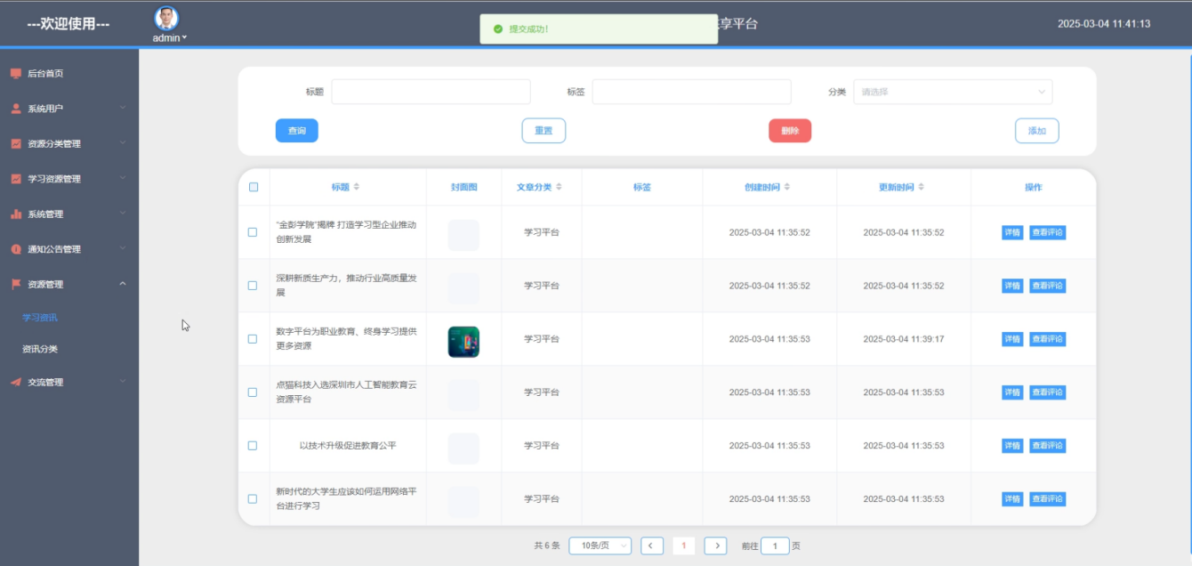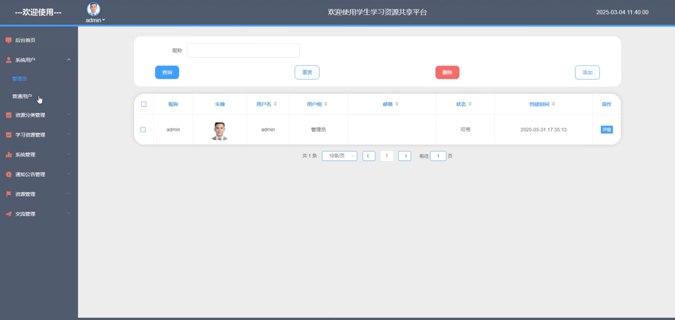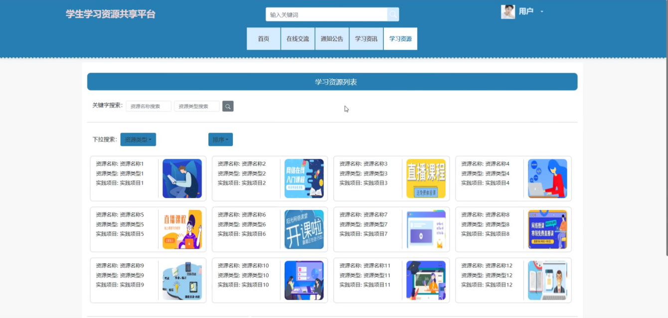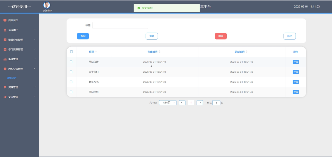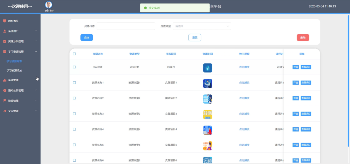 用户进入系统可以查看首页、在线交流、通知公告、学习资讯、学习资源等操作。管理员登陆后,主要功能模块包括首页、系统用户(管理员、普通用户)、学习资源管理、资源分类管理、系统管理、通知公告管理、资源管理等功能....