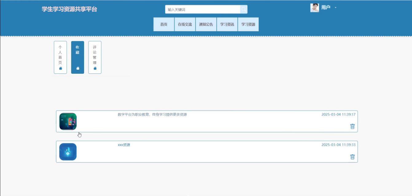 收藏:用户在此页面可查看自己所有收藏的资源列表,可进行查看或删除操作,如图4-6所示。