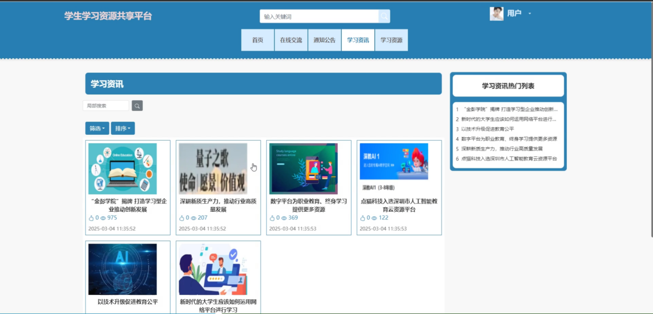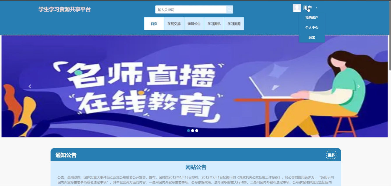 学生学习资源共享平台,在系统首页可以查看首页、在线交流、通知公告、学习资源、个人中心、学习资讯等内容,如图4-1所示。