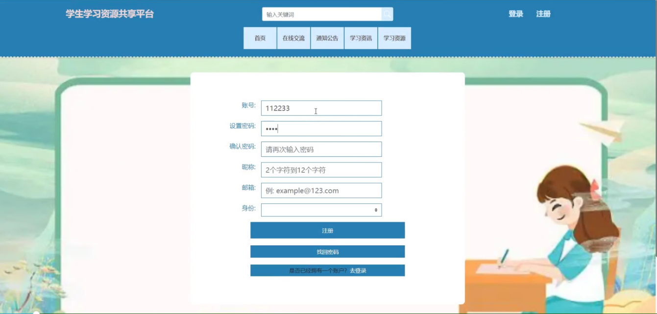 用户注册:用户在注册页面通过填写用户账号、密码、昵称、身份、手机等信息完成用户注册,如图4-2所示。