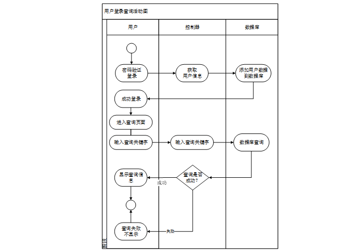 用户注册登录,系统从数据库获取用户数据信息,登录成功用户进入查询页面,用户输入查询关键字,数据库查询用户所输入的关键字,查询成功显示查询的模块信息,查询失败不显示。用户登录查询功能的活动图如图2-3所示。