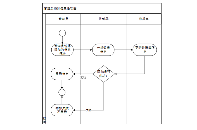 此活动图描述了管理员添加信息。管理员可以通过信息管理模块页面选择要添加的基本信息。添加成功传入数据库中,失败则不添加。管理员可以保存信息并更新系统中的信息。管理员添加信息功能的活动图如图2-4所示。