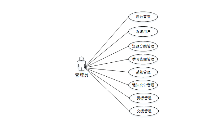 管理员登陆后,主要功能模块包括首页、系统用户(管理员、普通用户)、学习资源管理、资源分类管理、系统管理、通知公告管理、资源管理等功能。管理员用例图如图2-2所示。
