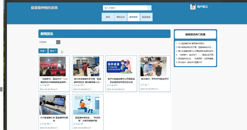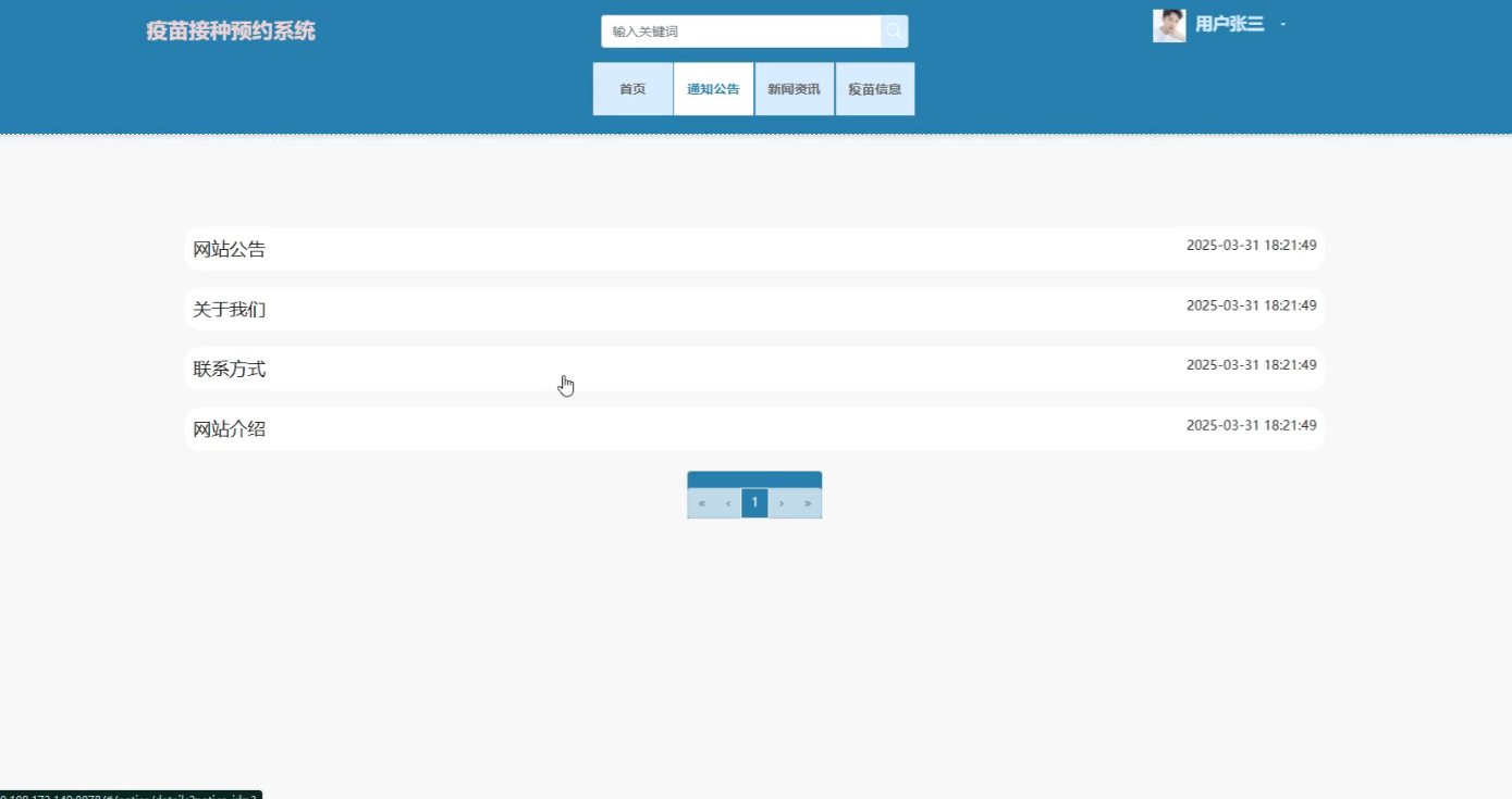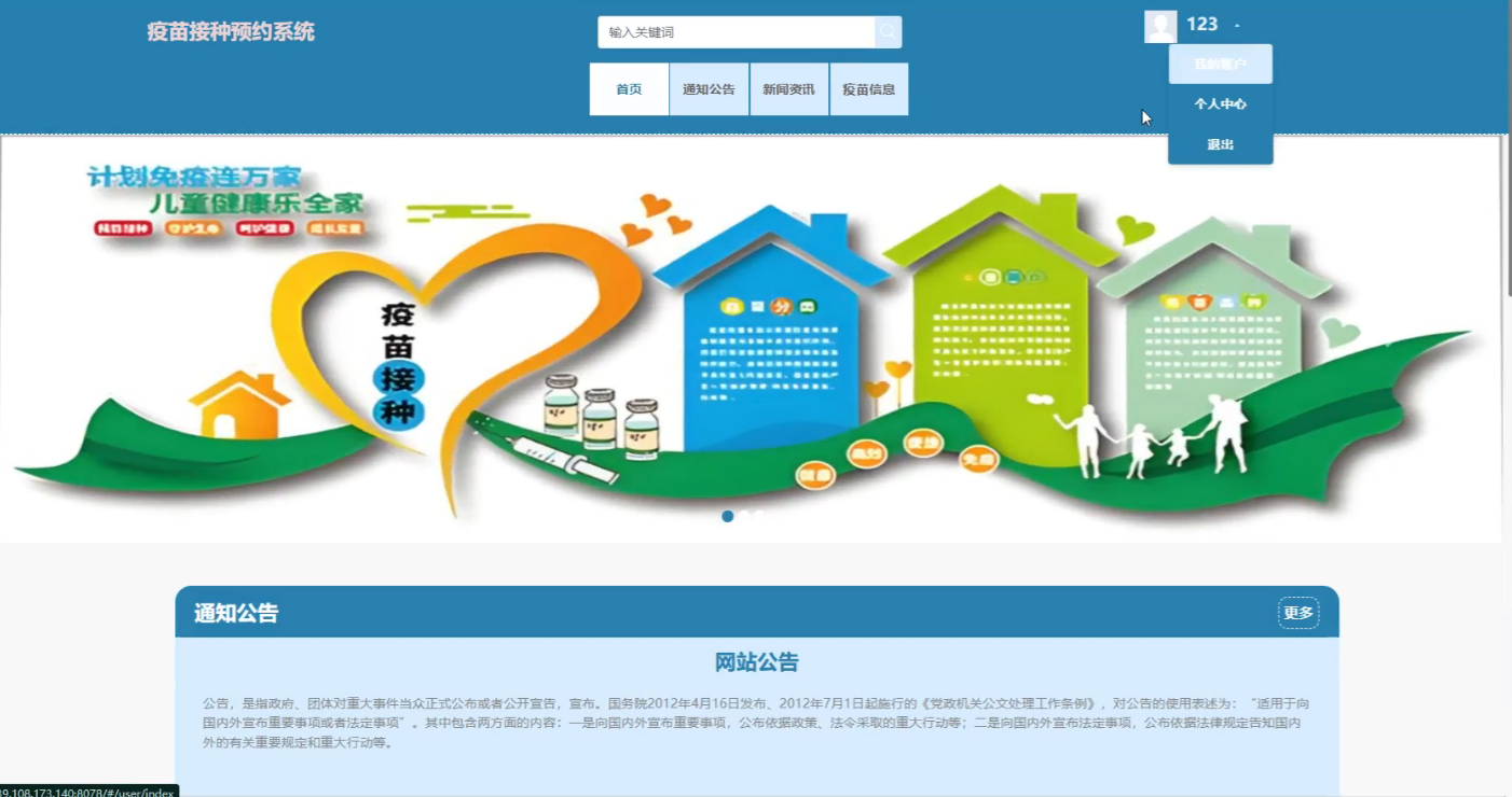 首页:用户登录后首先看到的页面,提供了一个概览,包括通知公告、新闻资讯和疫苗信息等重要更新和消息,方便用户快速获取最新信息。