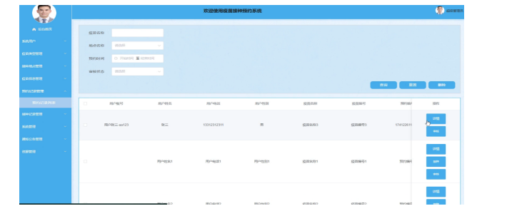 此模块允许管理员删除无效或错误的预约记录、查询和查看预约详情,以及审核和管理接种状态。模块如下图所示。