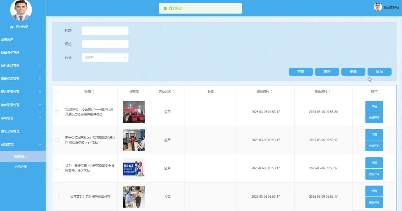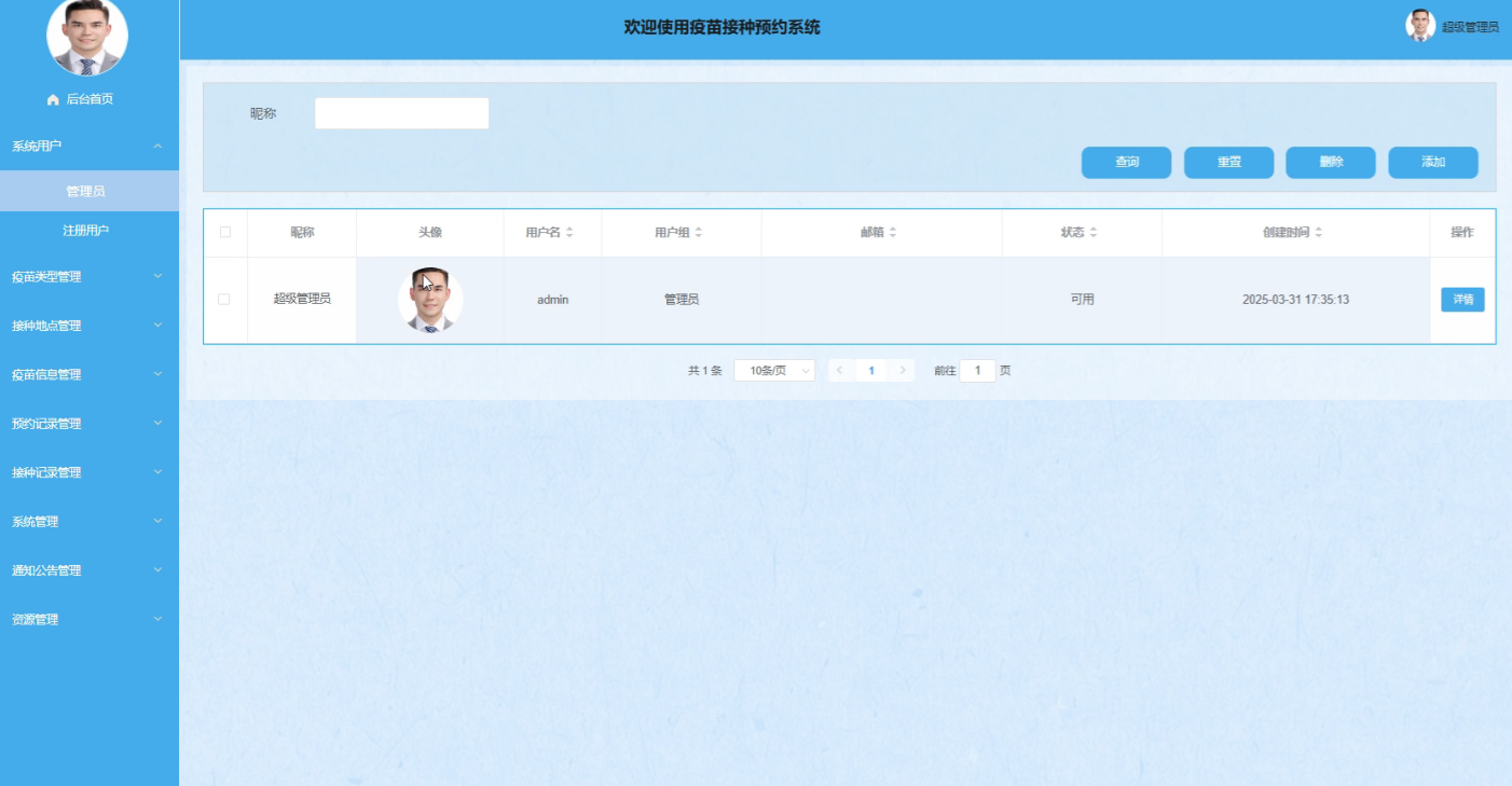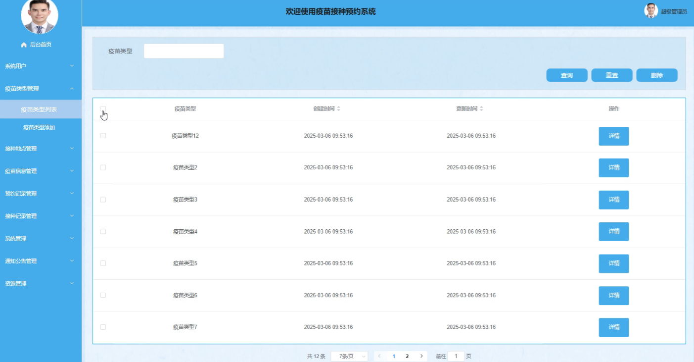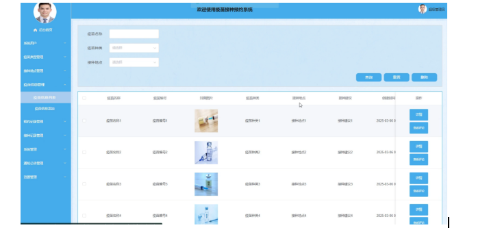 疫苗类型管理:管理员可以在此模块添加新的疫苗类型、删除不再使用的疫苗类型以及查询和查看疫苗类型的详细信息。