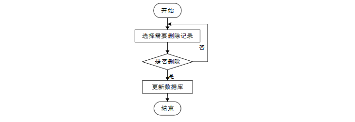 用户选择需要删除的记录后,系统判断是否确认删除。若未确认,返回选择环节,若确认删除,则更新数据库,删除对应记录,完成操作后流程结束。删除信息流程图如下图所示。