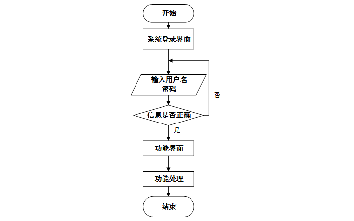 用户首先进入系统登录界面,输入用户名和密码后,系统验证信息是否正确。若验证失败,返回登录界面重新输入,若验证成功,则进入功能界面,执行相应功能处理后结束操作流程。操作流程如下图所示。