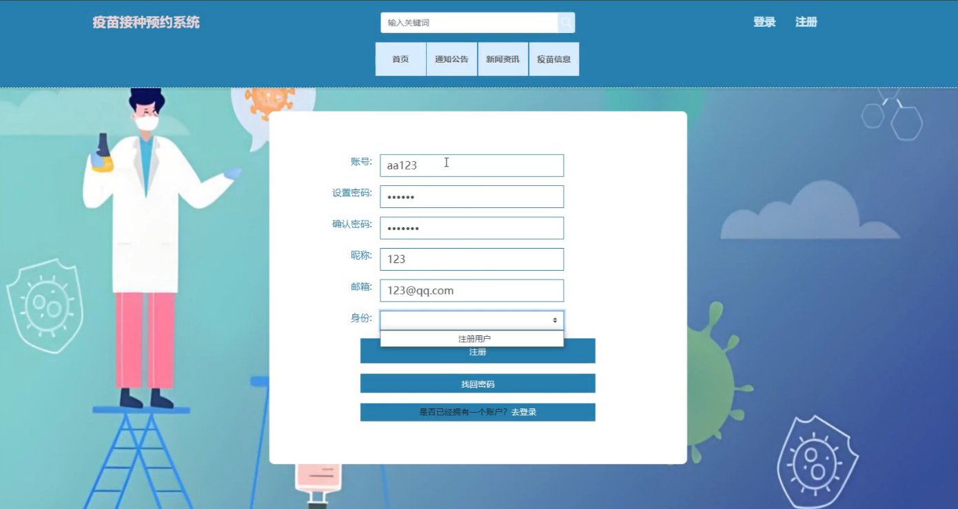 前端注册用户模块:注册登录:用户可以通过填写注册表单来创建一个新账户,注册成功后,使用相同的用户名和密码登录系统,以便访问个人数据和进行操作。首页:用户登录后首先看到的页面,提供了一个概览,包括通知公告、新闻资讯和疫苗信息等重要更新和消息,方便用户快速获取最新信息。通知公告:此部分展示系统发布的官方通知和公告,用户可以查看最新的政策变动、活动信息等,确保不会错过重要消息。新闻资讯:用户可以阅读最新