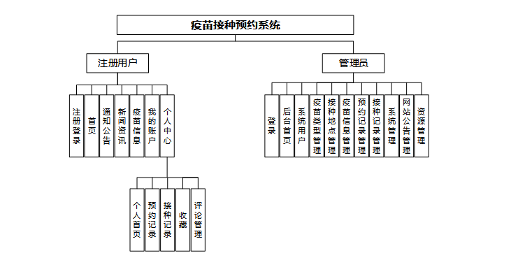 在上一章节中主要对系统的功能性需求和非功能性需求进行分析,并且根据需求分析了本疫苗接种预约系统平台系统中的用例。那么接下来就要开始对本疫苗接种预约系统平台系统的架构、主要功能和数据库开始进行设计。疫苗接种预约系统平台系统根据前面章节的需求分析得出,疫苗接种预约系统平台系统的功能模块图如下图所示。