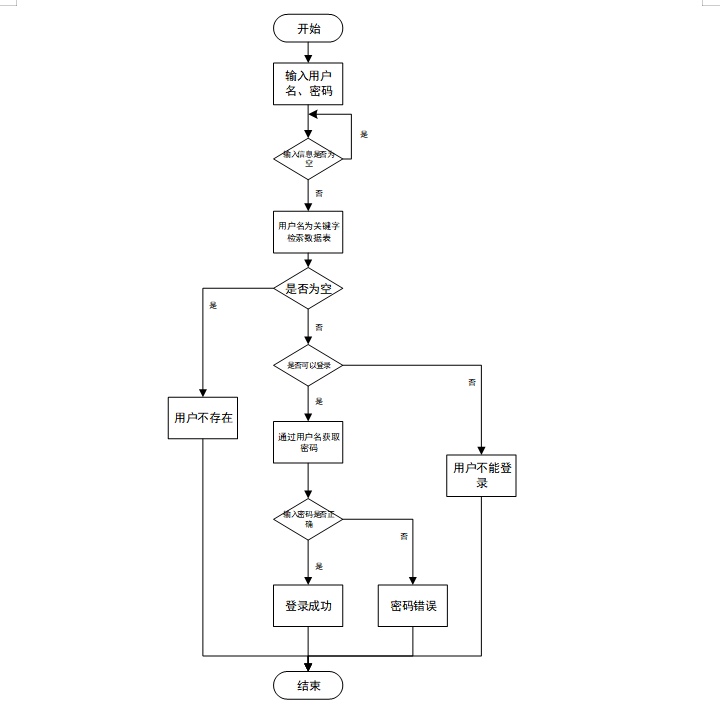 用户输入用户名和密码后,系统先检查输入是否为空,再验证用户名是否存在,若存在则通过用户名获取密码并校验。若密码正确则登录成功,否则提示密码错误。若用户名不存在或无法登录,提示用户操作无效。如下图所示。