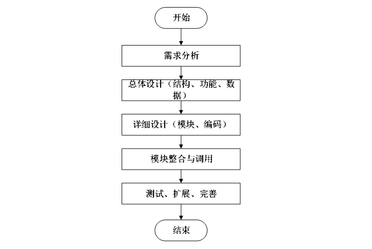 系统开发流程的主要步骤,从需求分析到系统完成的全过程。流程包括需求分析、总体设计(结构、功能、数据)、详细设计(模块、编码)、模块整合与调用,以及测试、扩展和完善,最终完成系统的开发。本系统的开发流程如下图所示