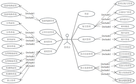 管理员主要功能模块有:账号管理(管理员账号管理、管理员账号添加、注册用户管理、添加新用户、密码修改)、地区管理(地区添加、地区查询)、景点信息管理(景点信息添加、景点信息查询)、地方美食管理(美食分类添加、美食分类查询、地方美食添加、地方美食查询)、旅游线路管理(旅游线路添加、旅游线路查询)、订单信息管理、新闻管理(分类添加、分类查询、新闻添加、新闻查询)、系统管理(友情链接添加、友情链接查询、轮播图添加、轮播图查询、留言管理)。管理员用例图如图3-1所示。