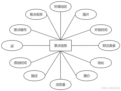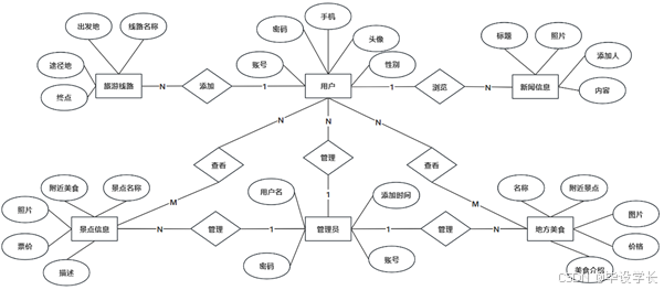 畅游天下旅游平台的数据库概念设计围绕核心业务实体展开,重点构建了管理员与用户两大角色实体,分别支撑后台管理与前端服务。管理员实体用于存储平台运营人员的权限及操作日志,确保景点信息、美食数据、旅游线路等内容的规范录入与动态更新,同时通过订单管理实现业务监管;用户实体则记录游客注册信息及行为数据,为景区浏览、线路订阅、留言互动等功能提供身份绑定基础。此外,系统关联设计了景点、美食、线路等业务实体,通过外键关联实现多角色数据共享(如用户可查询管理员维护的景点详情),并借助订单实体完成服务交易的闭环。这一设计既满足角色权限隔离(如管理员可操作用户不可见的数据层),又通过实体关联实现业务逻辑的协同流转,确保数据的一致性与服务的高效性。