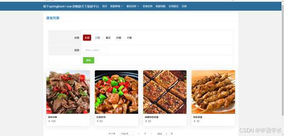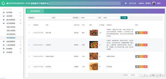 管理员可以通过输入线路名称对旅游线路列表进行精确查询,查看旅游线路的详细信息,包括线路编号、线路名称、图片等。此外,管理员还可以对景点信息进行管理操作,如查看、修改、删除操作。管理员地方美食查询管理页面如图5-4所示。