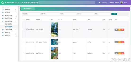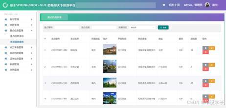 管理员可以通过输入景点名称对景点列表进行精确查询,查看景点的详细信息,包括景点编号、所属地区、图片等。此外,管理员还可以对景点信息进行管理操作,如查看、修改、删除操作。管理员景点信息管理页面如图5-2所示。