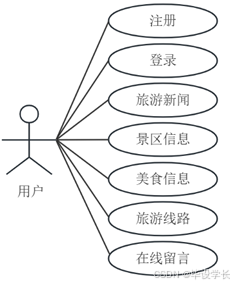 用户系统包括旅游新闻、景区信息 、美食信息、旅游线路、在线留言、注册。用户用例图如图3-2所示。