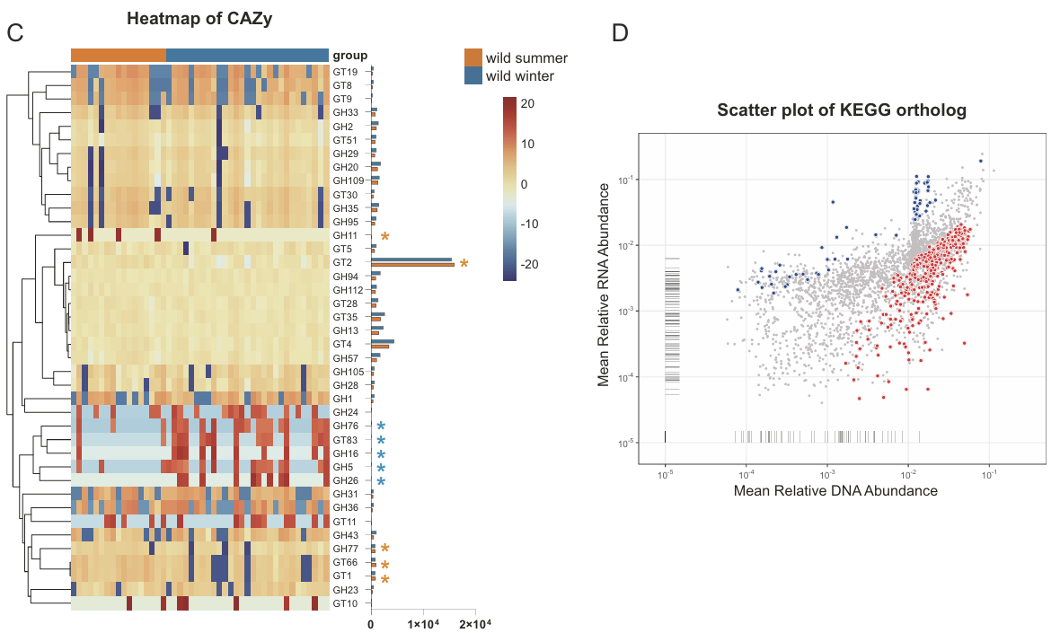 摘要(150字) 本研究通过宏基因组与宏转录组分析,揭示了金丝猴肠道微生物组响应季节性饮食变化的适应机制。研究发现野生金丝猴肠道微生物在夏季富集植物次生代谢功能,冬季则转向地衣多糖降解和能量平衡相关菌群(如毛螺菌科),而圈养个体微生物组无显著季节性波动。研究重建了578个宏基因组,其中76.5%为新菌种,凸显了金丝猴肠道微生物的高度新颖性。结果表明肠道微生物通过功能可塑性帮助宿主适应环境变化,为濒