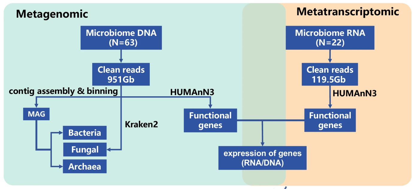 研究从63个粪便样本中获得了2.2Tb的宏基因组原始数据,质控后保留951Gb用于组装分析。宏转录组测序从22个样本中产生了119.5Gb的高质量数据。通过严格的质控标准,最终获得578个非冗余宏基因组,其中398个达到高质量标准(完整度>90%,污染度<5%)。