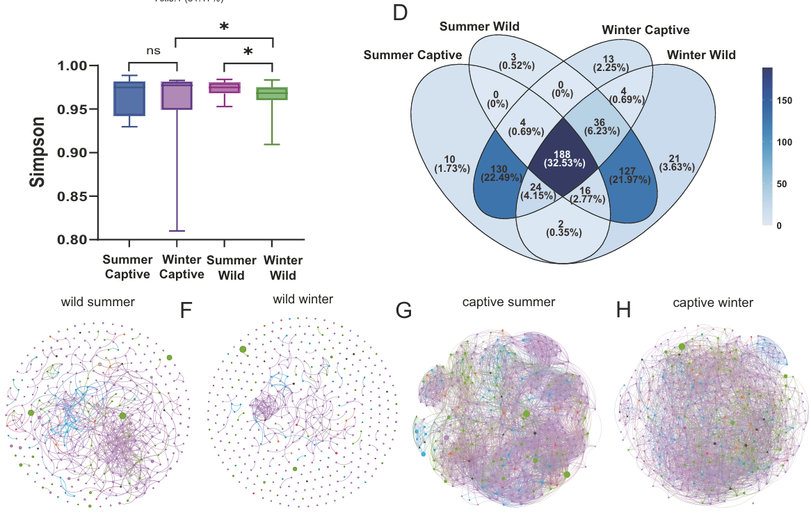野生金丝猴肠道微生物组表现出明显的季节性分离模式,夏季和冬季样本在PCoA分析中形成不同的聚类。肠型分析显示野生夏季组主要属于肠型2(76.5%),冬季组主要属于肠型3(70%),而圈养组无论季节都属于肠型1。Alpha多样性分析表明野生金丝猴夏季的Simpson指数显著高于冬季(P<0.05),而圈养组没有季节性差异。共现网络分析发现,野生金丝猴肠道微生物群落存在明显的季节性差异,夏季群体网络稳定性更强(聚类系数0.101),而冬季群体稳定性较低(聚类系数0.039)。同时,野生金丝猴的微生物网络比圈养猴子更稀疏简单,表明环境条件显著影响肠道微生物群落的网络结构复杂性。