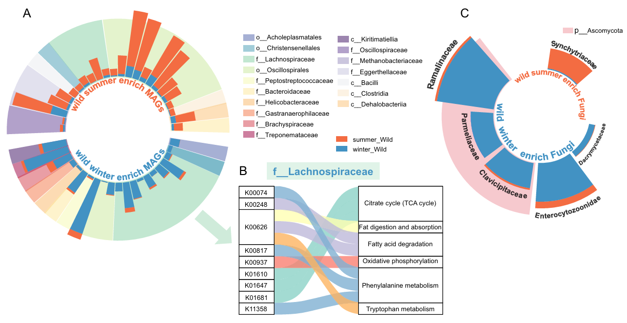 差异丰度分析鉴定出24个在夏季显著富集的MAGs和21个在冬季显著富集的MAGs。冬季富集的毛螺菌科细菌共享多个与能量代谢相关的独特基因,包括柠檬酸循环(K01610、K01647、K01681)、脂肪酸降解(K00248、K00626)和氧化磷酸化(K00937)相关基因。真菌分析发现冬季显著富集了地衣形成真菌Parmeliaceae和Ramalinaceae。