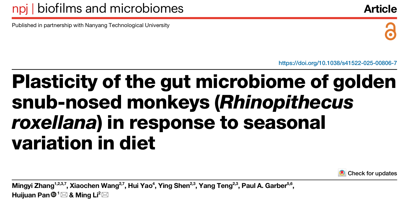Zhang, M., Wang, X., Yao, H. et al. Plasticity of the gut microbiome of golden snub-nosed monkeys (Rhinopithecus roxellana) in response to seasonal variation in diet. npj Biofilms Microbiomes 11, 169 (2025). https://doi.org/10.1038/s41522-025-00806-7
